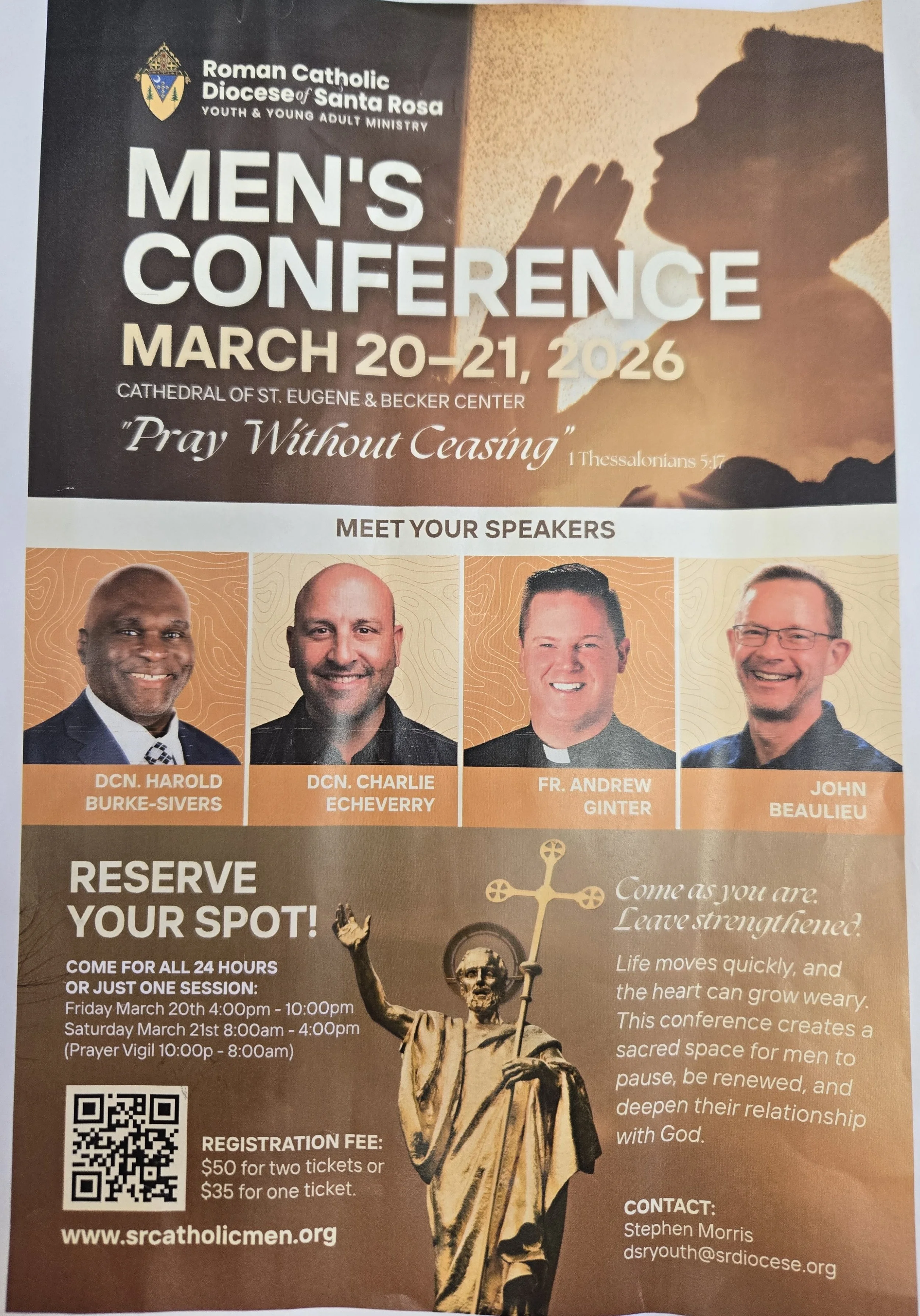 RENEW YOUR SPIRIT - You're Invited to the St. Apollinaris Lenten Retreat – “Renewing Our Baptismal Promises” – Saturday February 21, 9:00-12:30 pm in the church. Fr. John Ouellette, CFR, of the Franciscan Friars of the Renewal, will reflect on the themes: where you are, the Kingdom of God is at hand, and renewing our Baptismal promises – with Exposition and Mass. Refreshments provided. Free will offering. To register: contact Jackie at jgongnapa@aol.com / 707-486-9502 or the St. A’s office 707-257-2555. Begin your Lenten journey towards deepening your spiritual life.